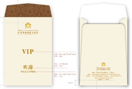酒店所用制的貴賓卡封套,主要用途是將酒店VIP卡進行貼切的包裝,可保護貴賓卡的表層,封套的風(fēng)格設(shè)計與酒店形成統(tǒng)一風(fēng)格,將一份精心包裝后的貴賓卡送至客人手中,讓顧客感受到酒店的用心與貼切。同時,也傳達了酒店僅在一個貴賓卡封面的設(shè)計也是花費了很大用心與精力去制作的,讓每一位客人感到酒店溫馨貼切的服務(wù),酒店也會在眾人眼前表現(xiàn)出最好最優(yōu)質(zhì)的服務(wù)形象!