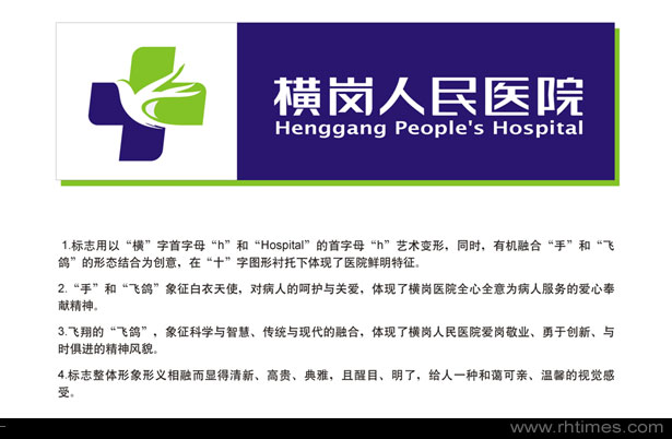 醫(yī)院LOGO設(shè)計(jì)整體形象形義相融而顯得清新、高貴、典雅,且醒目、明了,給人一種和藹可親、溫馨的感受,院徽還體現(xiàn)了醫(yī)療機(jī)構(gòu)的特征,體現(xiàn)橫崗人民醫(yī)院敬業(yè)、愛崗、團(tuán)結(jié)、協(xié)作、精誠(chéng)、仁愛、奉獻(xiàn)的主體文化。